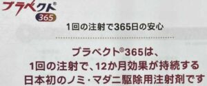 今シーズンの新商品として、1回の注射で1年有効なノミダニ駆除剤が発売されます。(3/4の時点では未発売)