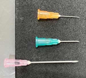 上;ワクチン接種・採血の時に使う25G 中;点滴の時に使う21G 下;大型犬に500mlを点滴する18G