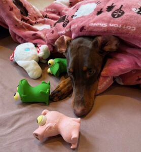 緑のカエルの人形が彼女の赤ちゃんです。(押すとキューキュー鳴るおもちゃです。)